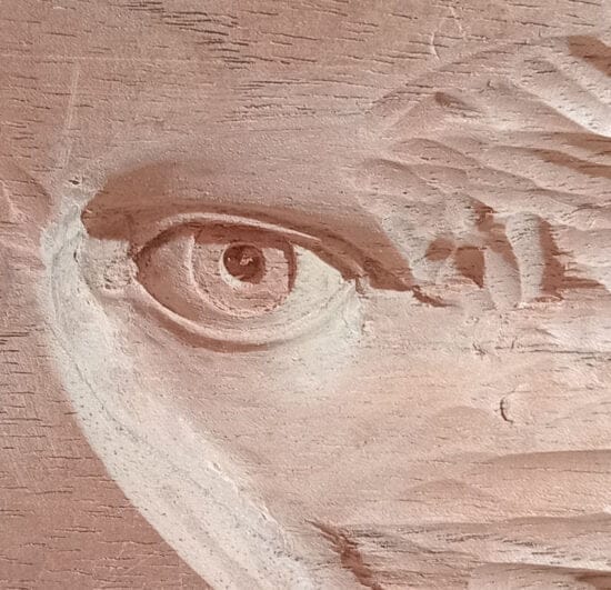 In the case of this small test sculpted eye the wood is Red Cedar.  It has a tight grain, finishes well, but is soft enough to be easily worked with hand tools.  It is also coloured light enough that the shadow relief isn’t lost, unlike much darker timbers.